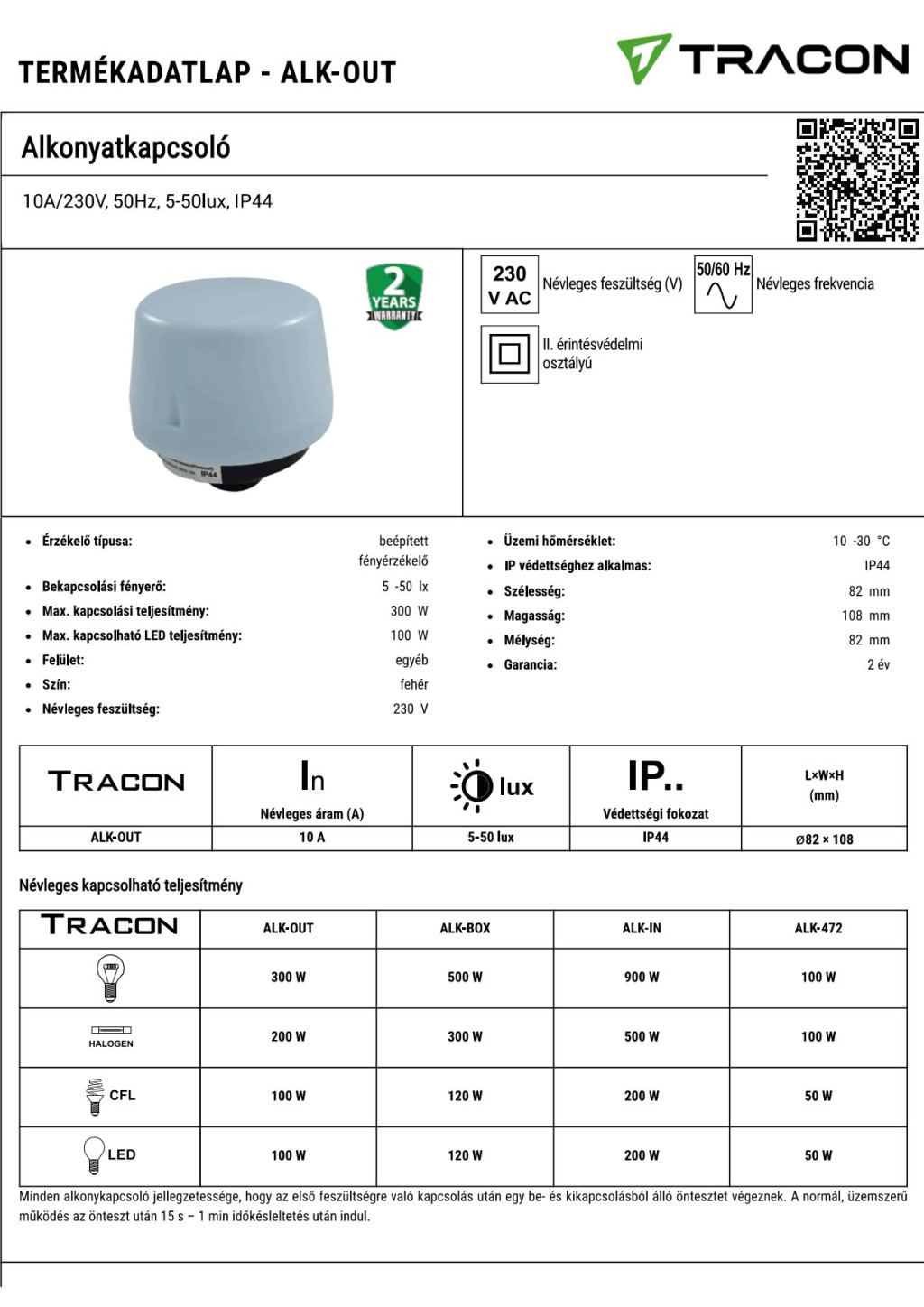 ALK-OUT Alkonyatkapcsoló10A/230V, 50Hz, 5-50lux, IP44