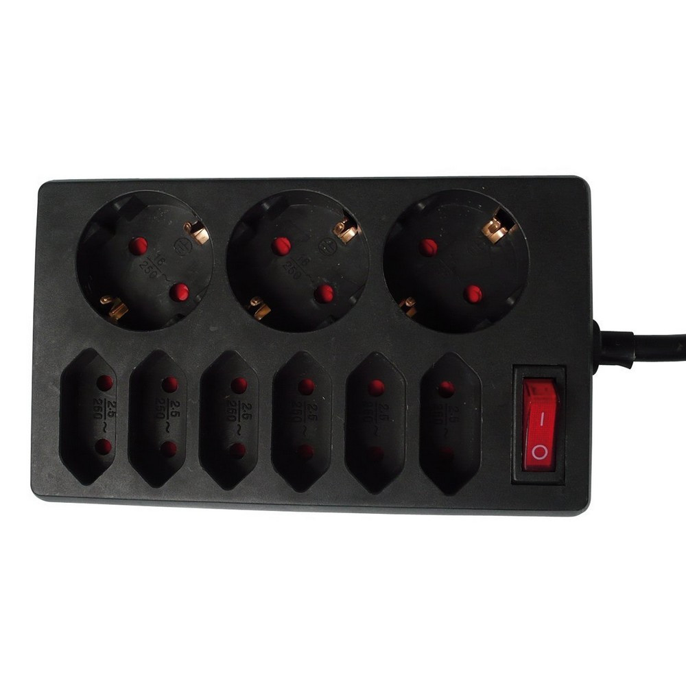 00250171 Asztali elosztó 6 Euro+3 f dugalj, kapcs.1,4m, fekete