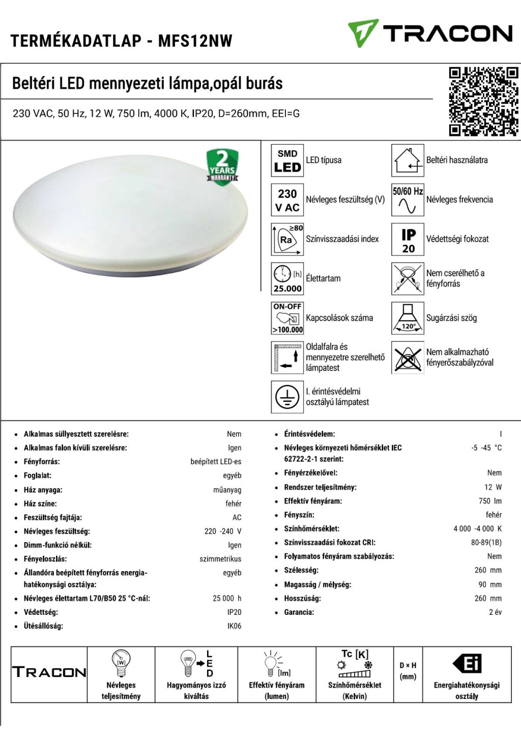 Műszaki adatok 230 VAC, 50 Hz, 12 W, 750 lm, 4000 K, IP20, EEI=G  width=