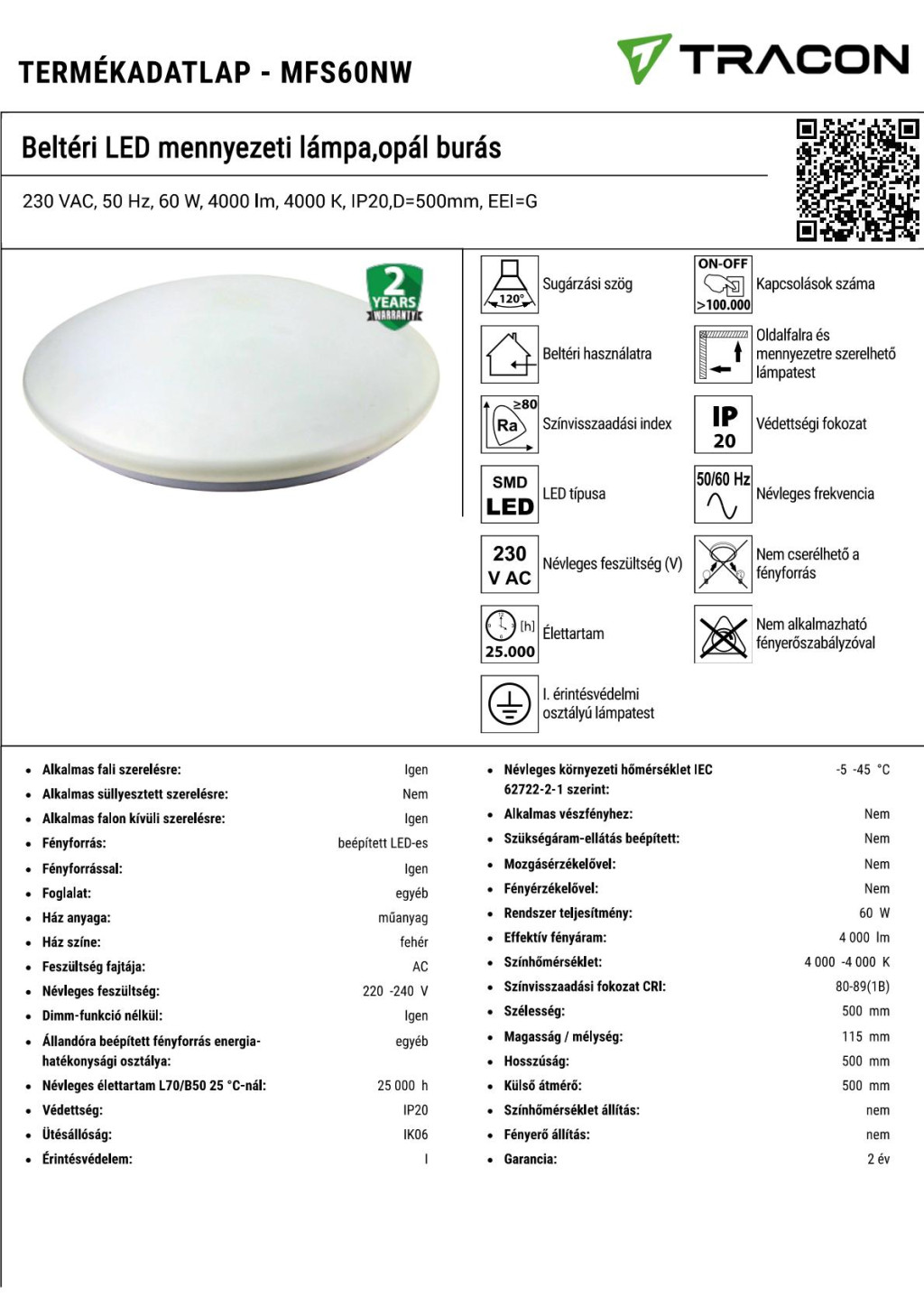 MFS60NW Beltéri LED mennyezeti lámpa,opál burás230 VAC, 50 Hz, 60 W, 4000 lm, 4000 K, IP20,D=500mm,