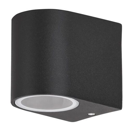 Modern megjelenésű kültéri fali lámpa 1 db foglalattal, lefelé világító kivitelben. 8 cm magas, 6,5 cm széles, fekete színű fémből készített lámpatest és üveg lámpabúra,