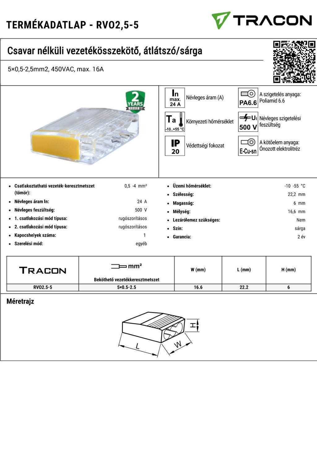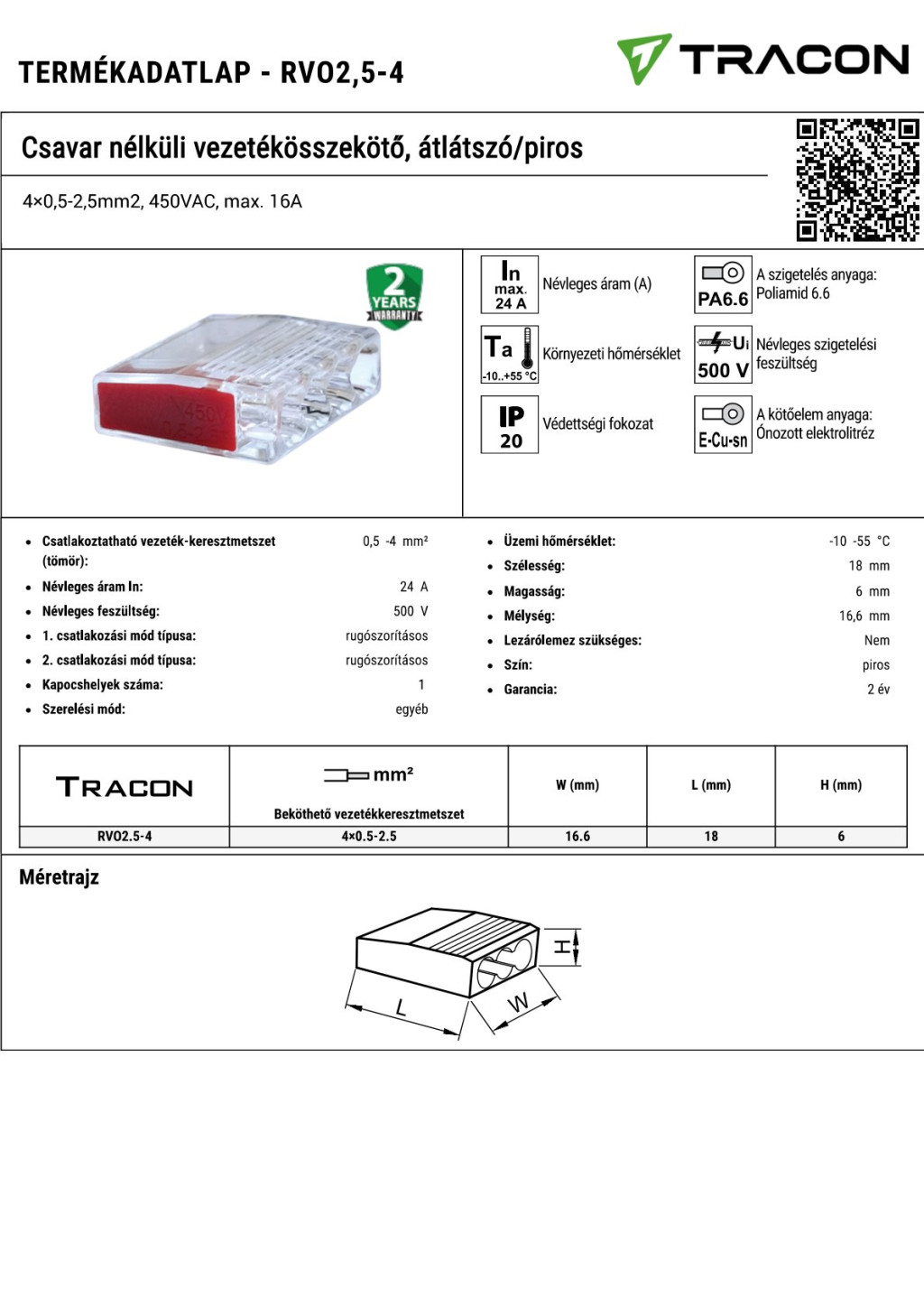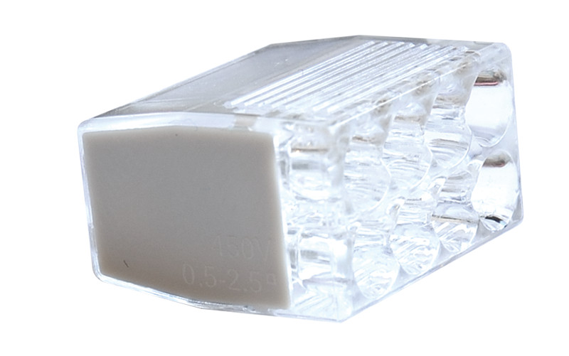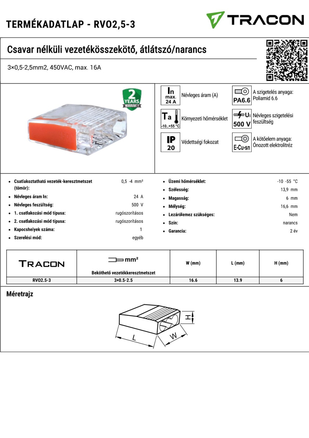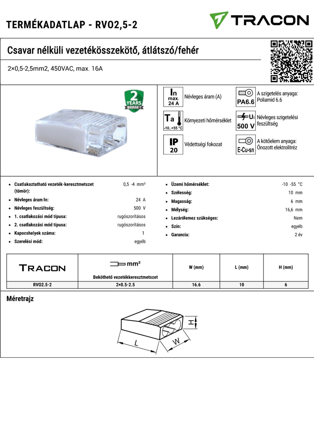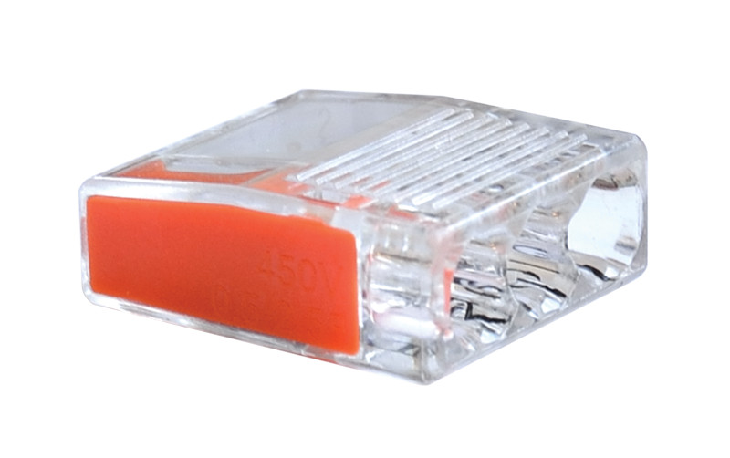 RVO2,5-2 Csavar nélküli vezetékösszekötő, átlátszó/fehér2×0,5-2,5mm2, 450VAC, max. 16A