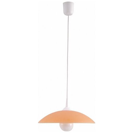 Időtlen megjelenésű fix kivitelű,függeszték 90 cm-es, fehér színű műanyag függesztékkel és 32,5 cm-es ármérőjű, íves kialakítású, narancssárga színű üvegbúrával. 1x E27 max. 60W teljesítményű fényforrással használható.