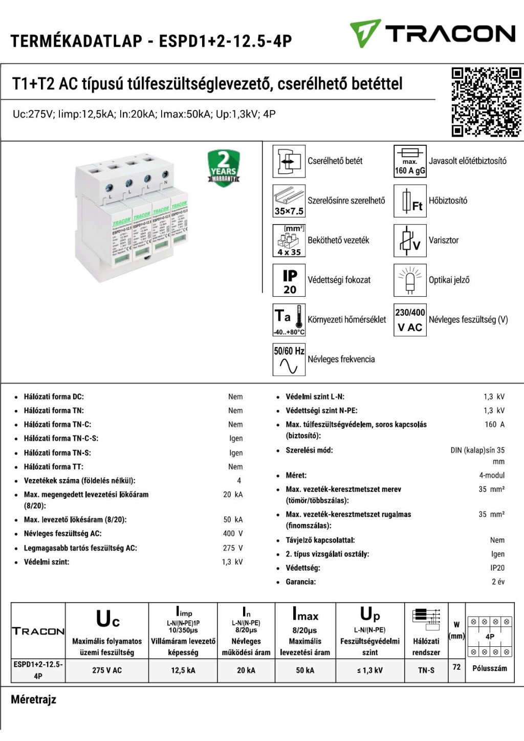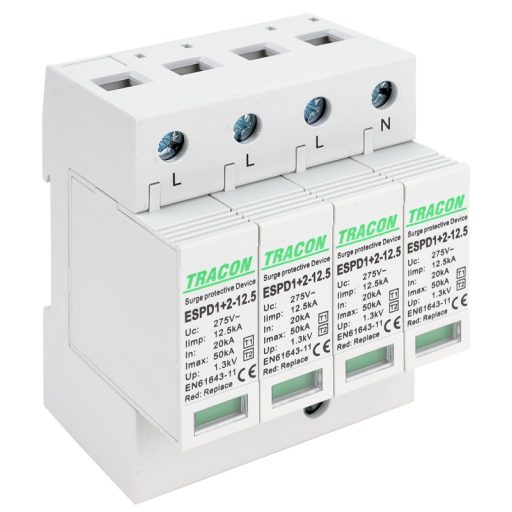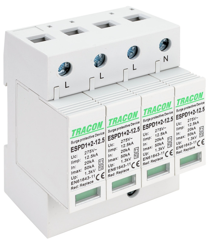 ESPD1+2-12.5-4P T1+T2 AC típusú túlfeszültséglevezető, cserélhető betéttel Uc:275V; Iimp:12,5kA; In:20kA; Imax:50kA; Up:1,3kV; 4P