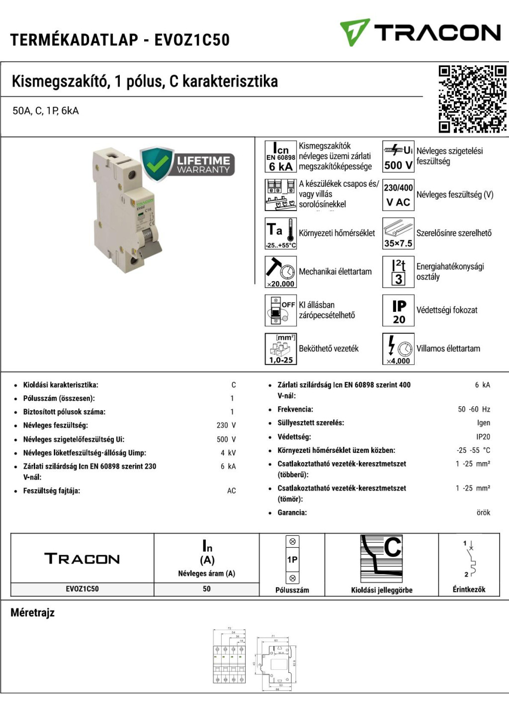 EVOZ1C50 Kismegszakító, 1 pólus, C karakterisztika 50A, C, 1P, 6kA