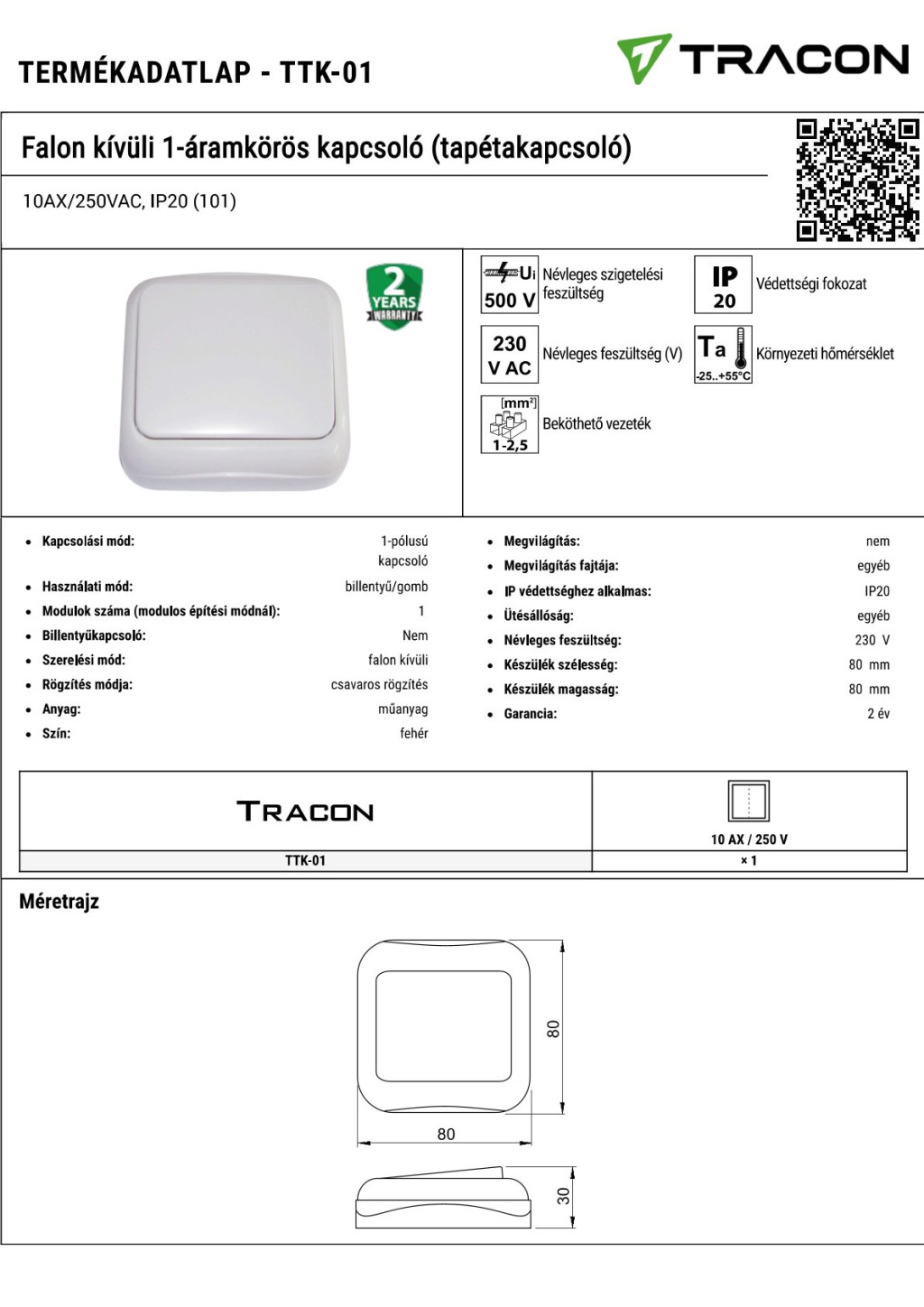 TTK-01 Falon kívüli 1-áramkörös kapcsoló (tapétakapcsoló)10AX/250VAC, IP20 (101)