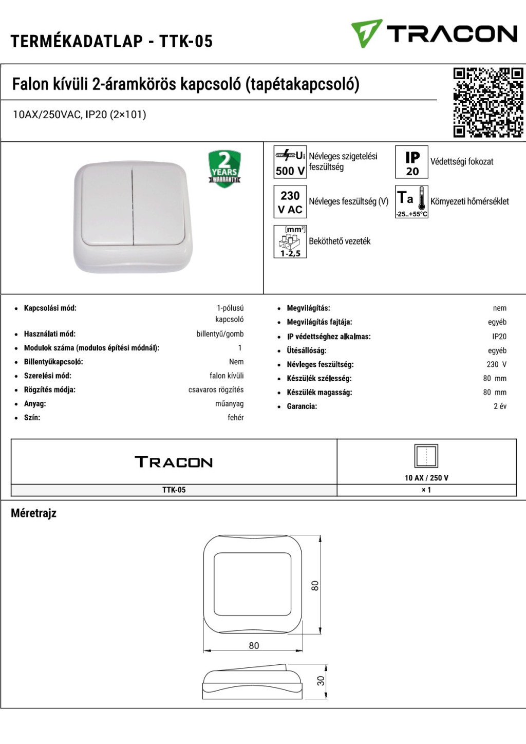 TTK-05 Falon kívüli 2-áramkörös kapcsoló (tapétakapcsoló)10AX/250VAC, IP20 (2×101)