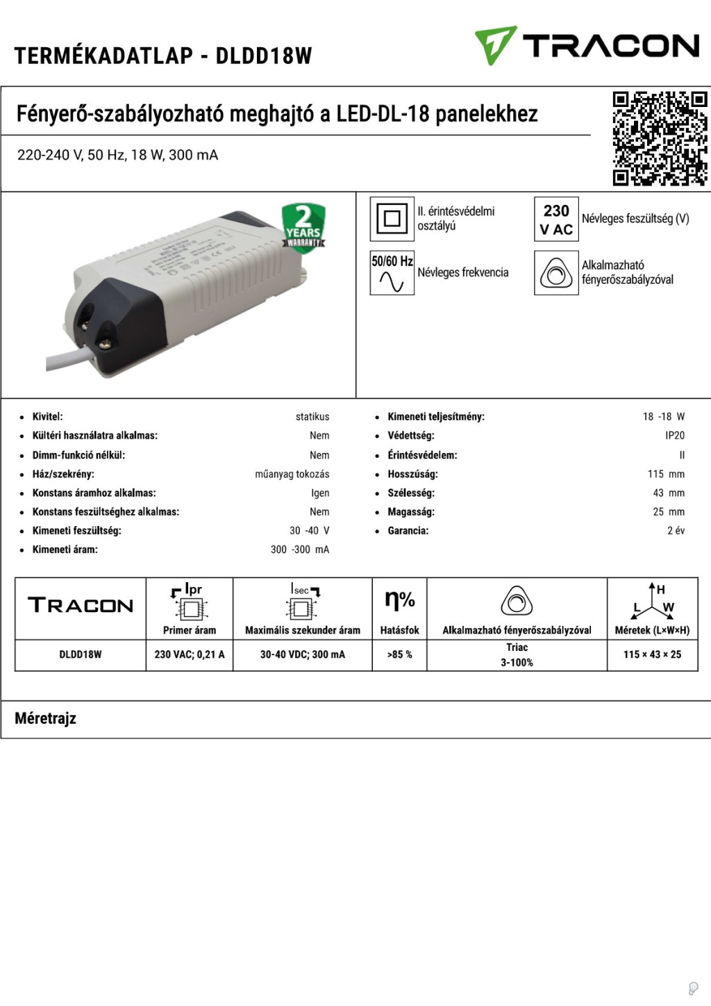 DLDD18W Fényerő-szabályozható meghajtó a LED-DL-18 panelekhez220-240 V, 50 Hz, 18 W, 300 mA