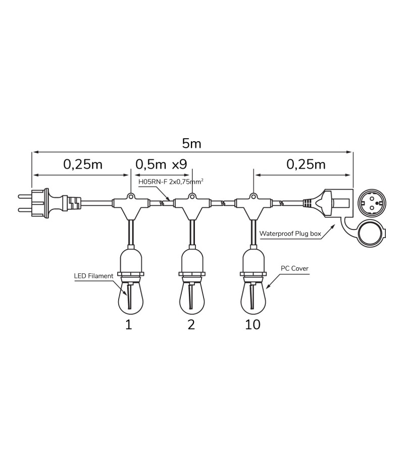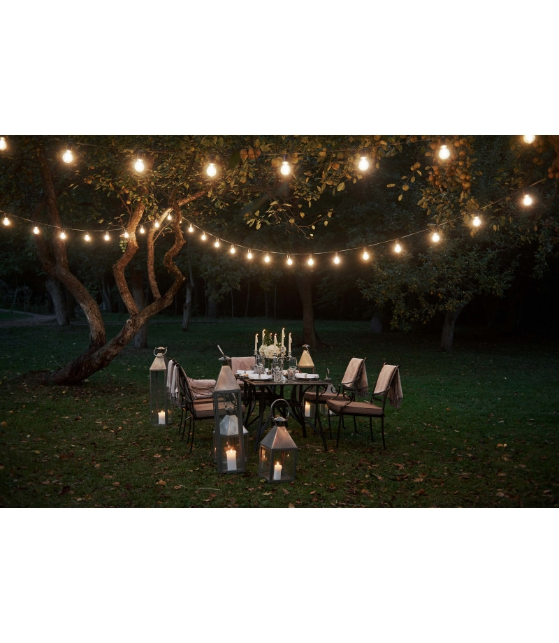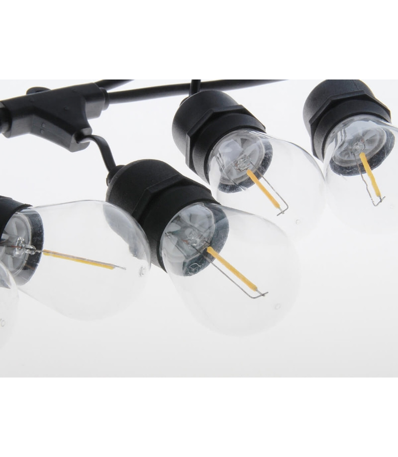 Az 5 m-es E27-es kerti girland egy fejlett kültéri világítási megoldás, amely rendkívüli rugalmasságot kínál az 1 W-os E27-es cserélhető fényforrásoknak köszönhetően. Minimalista dizájn és a polikarbonátnak köszönhetően nagy tartósság jellemzi. Ellenáll az időjárási viszonyoknak, hosszú távú megbízhatóságot garantál minden körülmények között. Az 50 cm-enként elhelyezett lámpák egyenletes fényeloszlást biztosítanak 270°-os szögben.