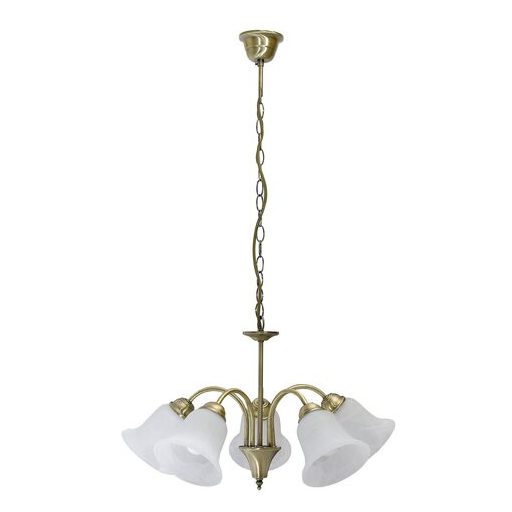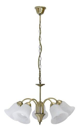 Klasszikus megjelenésű csillár 5 darab foglalattal. 90 cm lelógású, 60 cm átmérőjű, fémből készített lámpatest fehér alabástrom üvegbúrákkal. A csillár E14-es foglalatú, max. 5x 40W teljesítményű fényforrásokkal használható.