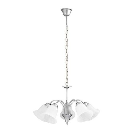 Klasszikus megjelenésű csillár 5 darab foglalattal. 90 cm lelógású, 60 cm átmérőjű, fémből készített lámpatest fehér alabástrom üvegbúrákkal. A csillár E14-es foglalatú, max. 5x 40W teljesítményű fényforrásokkal használható.