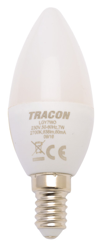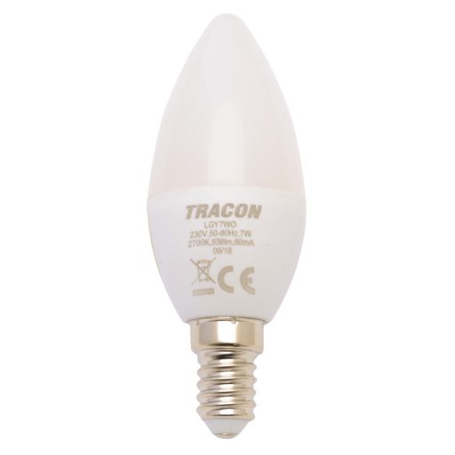 LGY7NW Gyertya burájú LED fényforrás, tejüveg230 V, 50 Hz, 7 W, 4000 K, E14, 600 lm, 180°, EEI=F