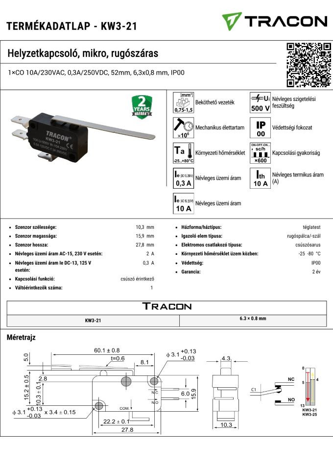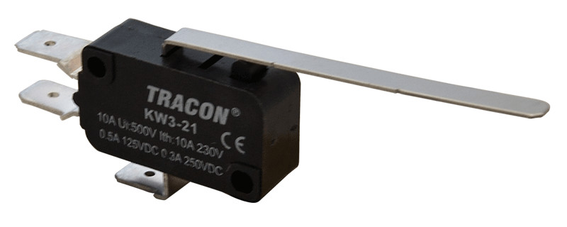 KW3-21 KW3-21 Helyzetkapcsoló, mikro, rugószáras1×CO 10A/230VAC, 0,3A/250VDC, 52mm, 6,3x0,8 mm, IP00