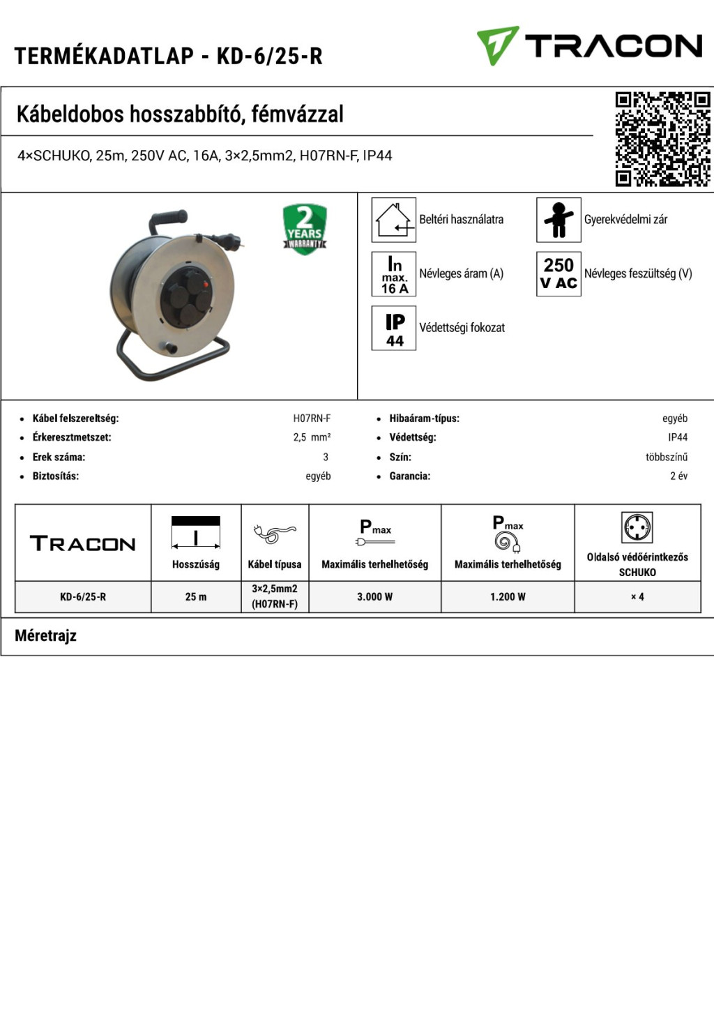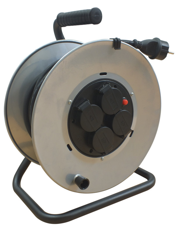 KD-6/25-R Kábeldobos hosszabbító, fémvázzal4×SCHUKO, 25m, 250V AC, 16A, 3×2,5mm2, H07RN-F, IP44