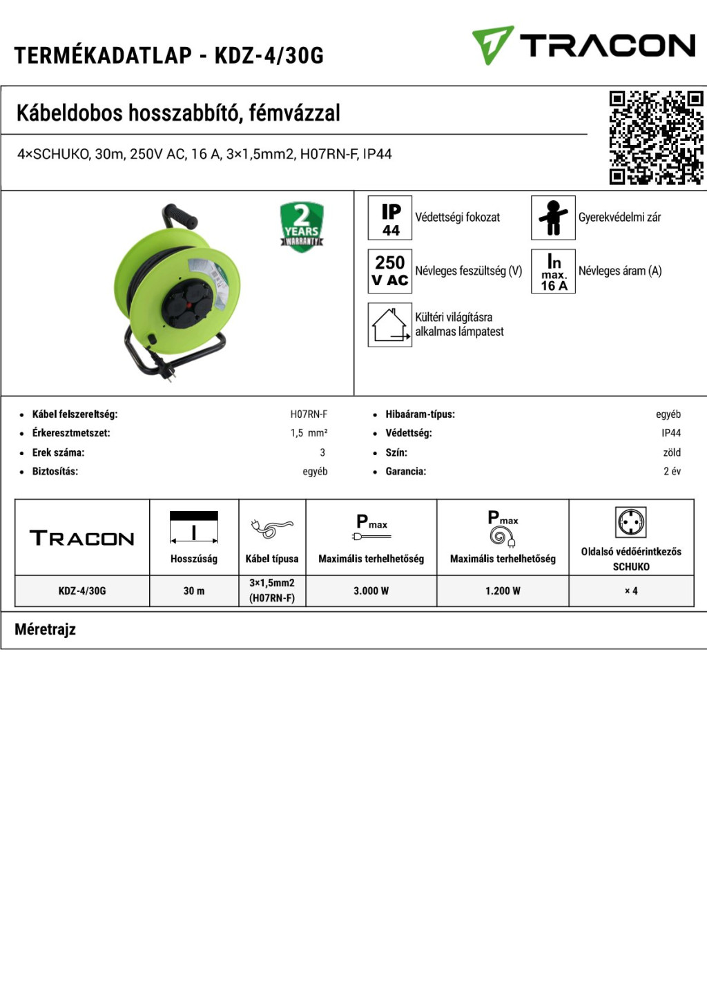 KDZ-4/30G Kábeldobos hosszabbító, fémvázzal4×SCHUKO, 30m, 250V AC, 16 A, 3×1,5mm2, H07RN-F, IP44