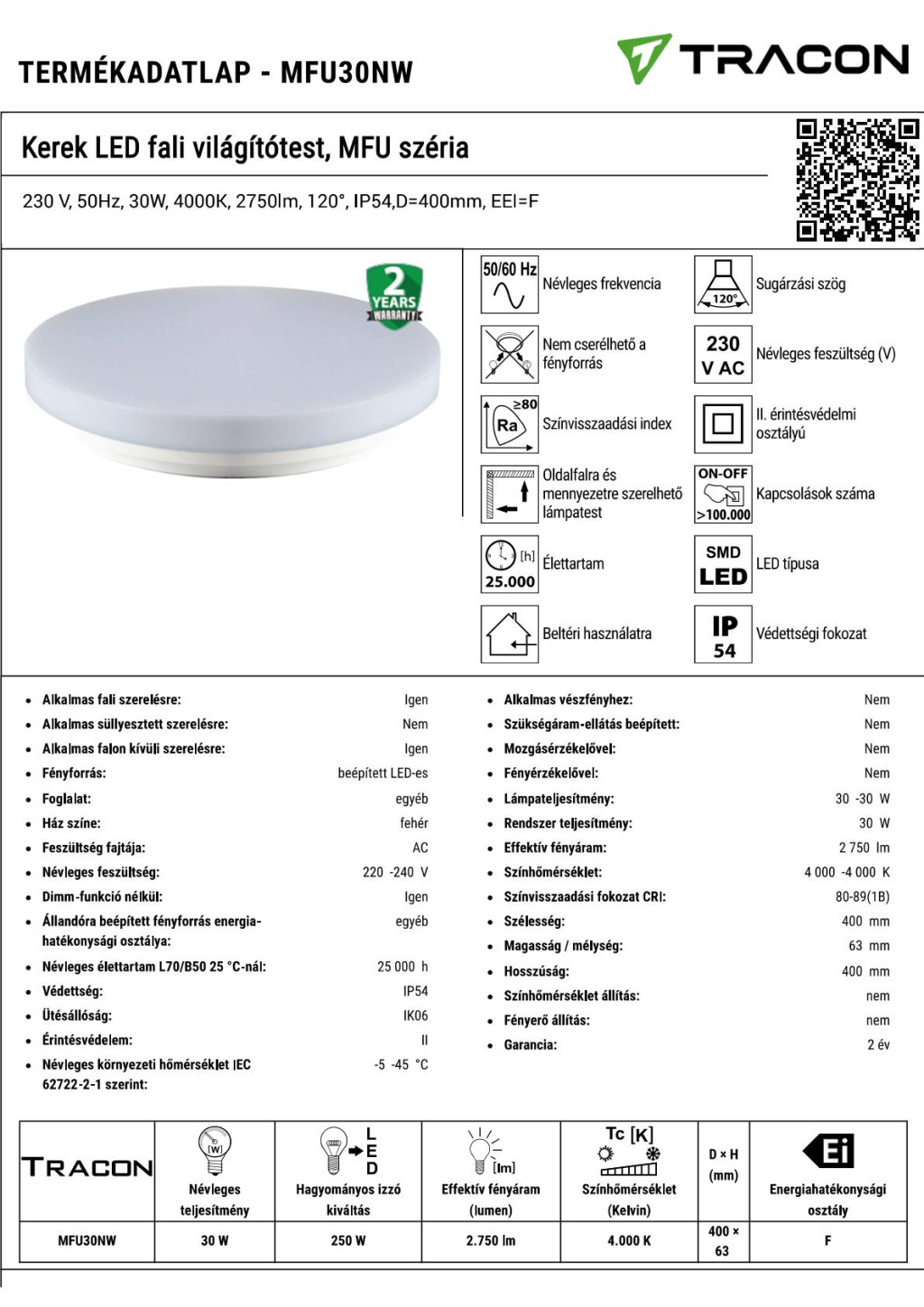 MFU30NW Kerek LED fali világítótest, MFU széria230 V, 50Hz, 30W, 4000K, 2750lm, 120°, IP54,D=400mm,