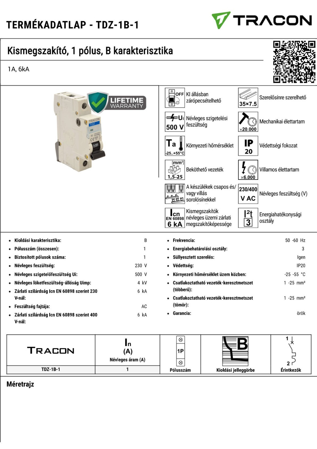 TDZ-1B-1 Kismegszakító, 1 pólus, B karakterisztika1A, 6kA
