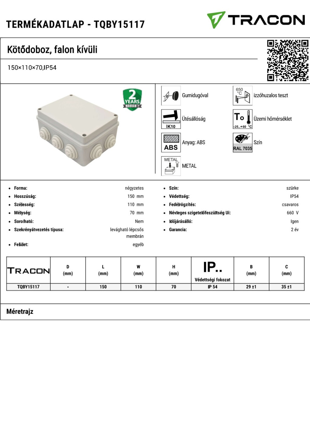 TQBY15117 Kötődoboz, falon kívüli150×110×70,IP54