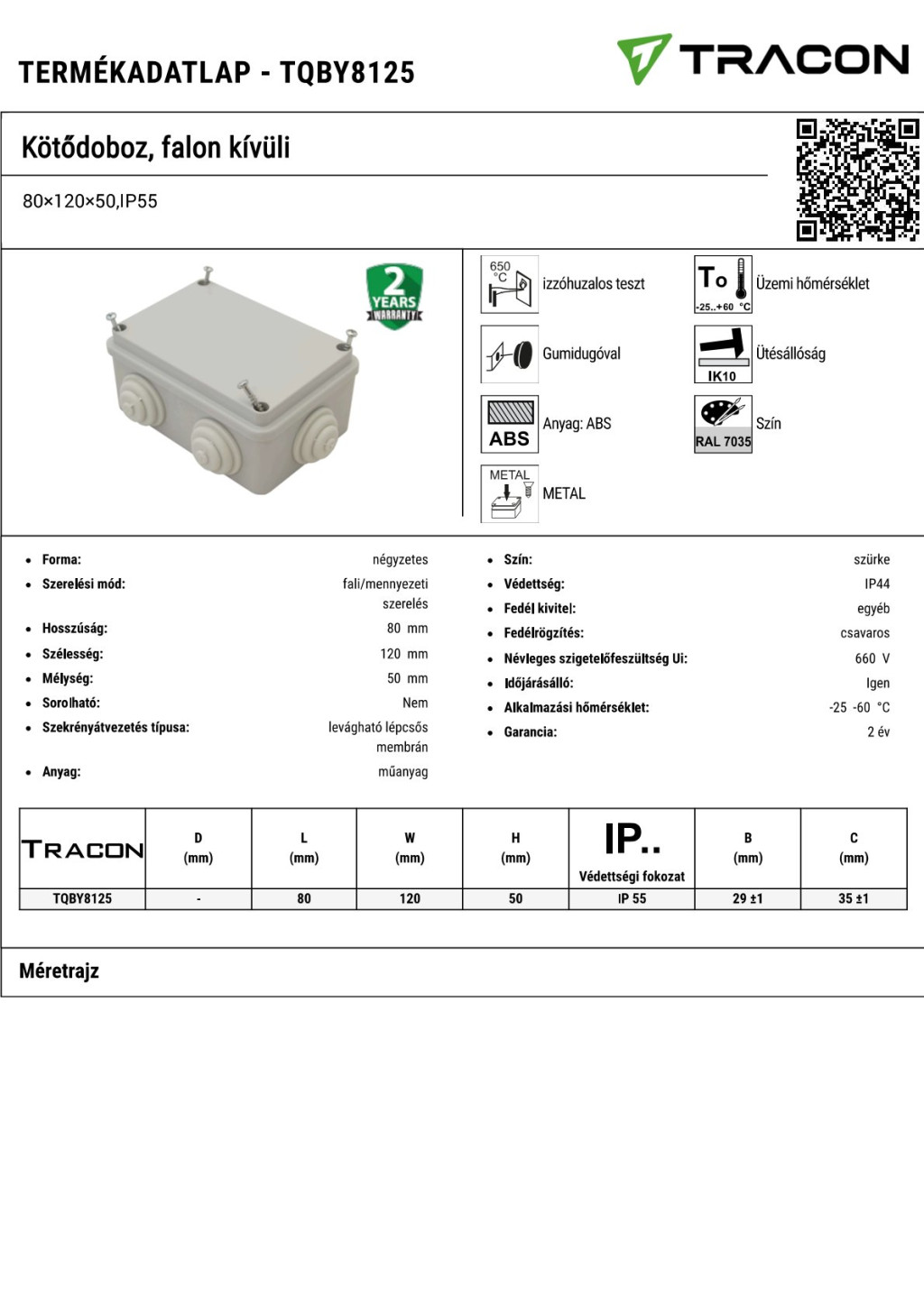 TQBY8125 Kötődoboz, falon kívüli80×120×50,IP55