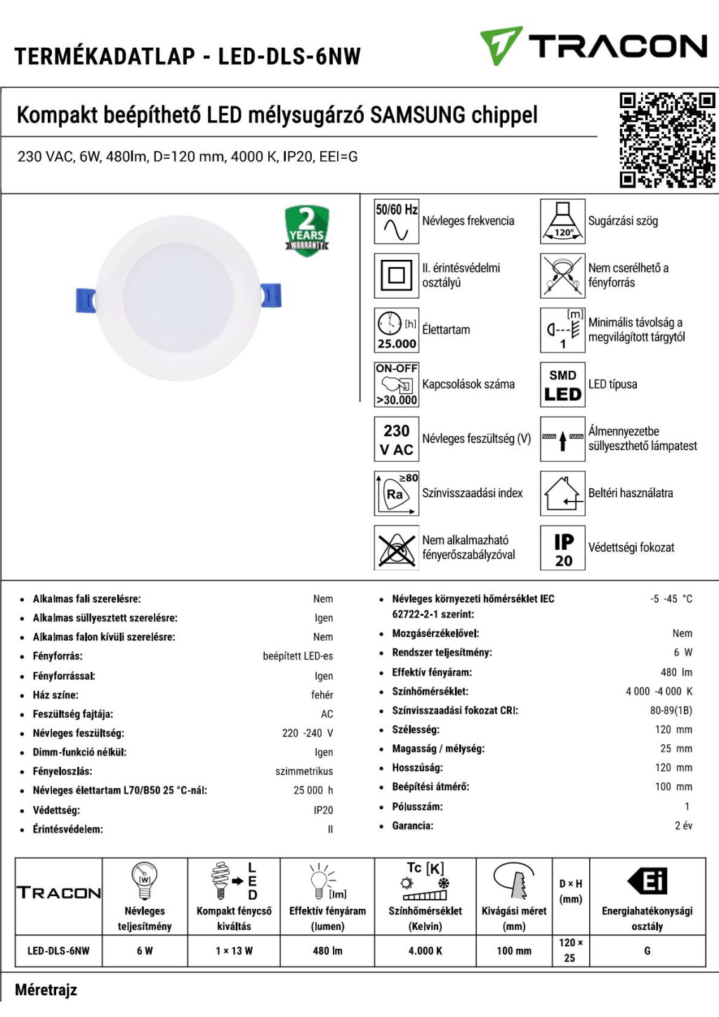 LED-DLS-6NW Kompakt beépíthető LED mélysugárzó SAMSUNG chippel 230 VAC, 6W, 480lm, D=120 mm, 4000 K,