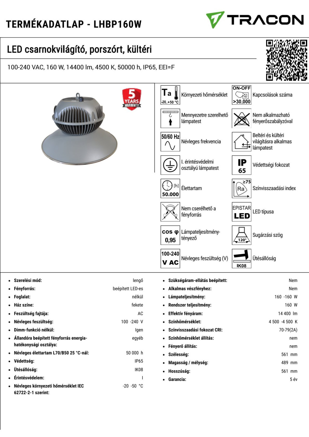 LHBP160W LED csarnokvilágító, porszórt, kültéri100-240 VAC, 160 W, 14400 lm, 4500 K, 50000 h, IP65,