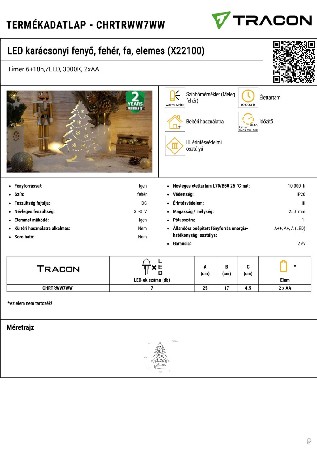 CHRTRWW7WW LED karácsonyi fenyő, fehér, fa, elemes (X22100)Timer 6+18h,7LED, 3000K, 2xAA