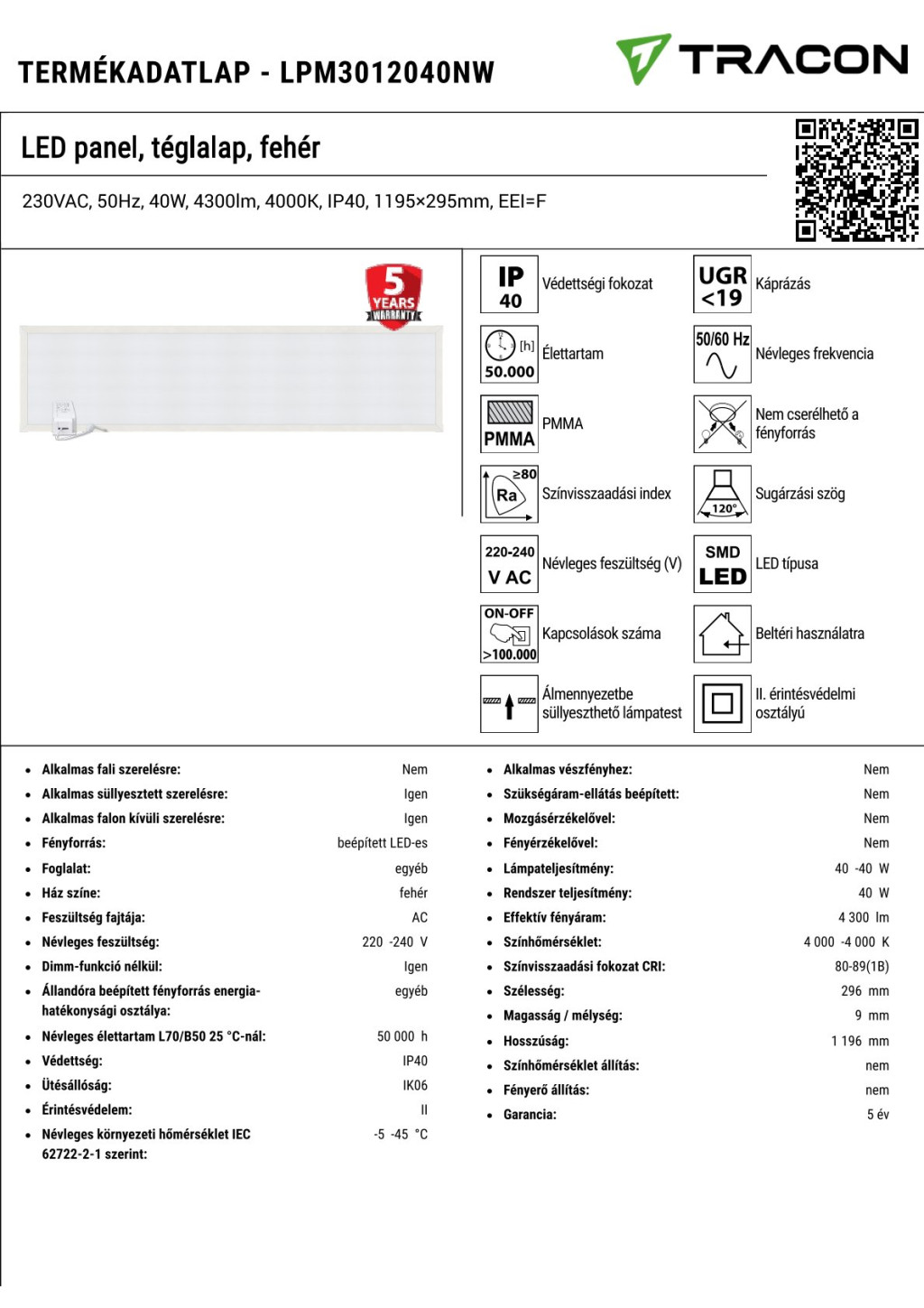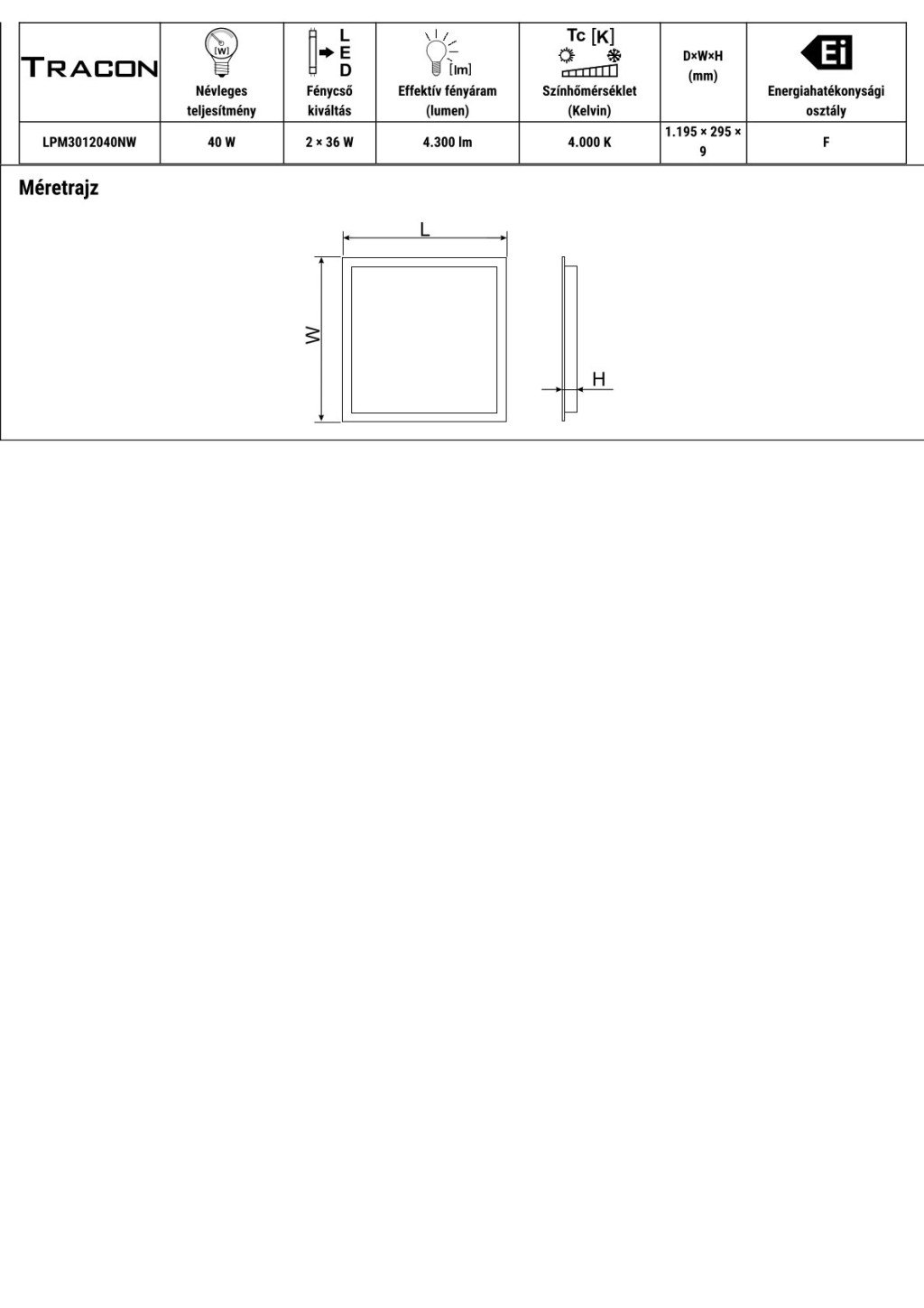 LPM3012040NW LED panel, téglalap, fehér230VAC, 50Hz, 40W, 4300lm, 4000K, IP40, 1195×295mm, EEI=F
