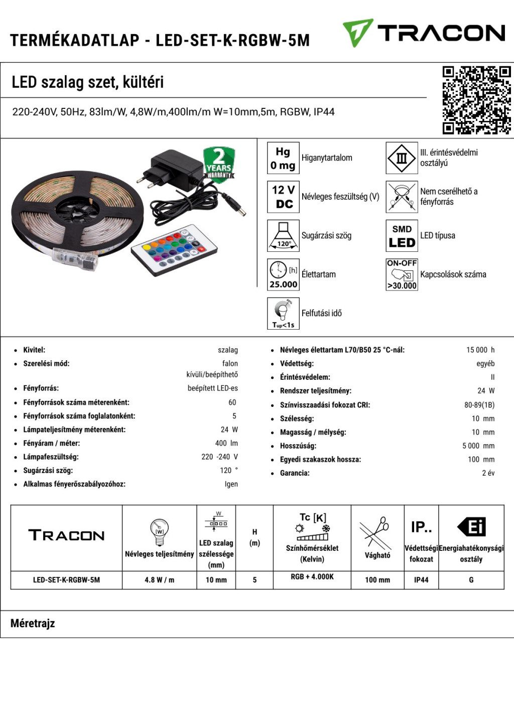 LED-SET-K-RGBW-5M LED szalag szet, kültéri220-240V, 50Hz, 83lm/W, 4,8W/m,400lm/m W=10m, 5m, RGBW, IP