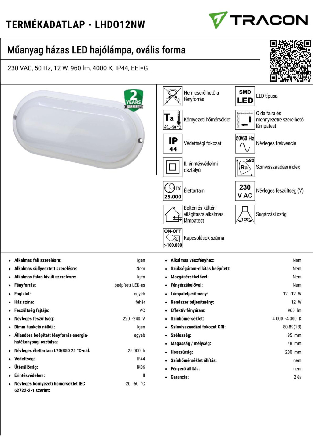 LHDO12NW Műanyag házas LED hajólámpa, ovális forma230 VAC, 50 Hz, 12 W, 960 lm, 4000 K, IP44, EEI=G