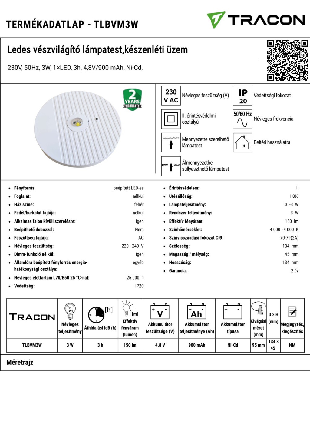 TLBVM3W Ledes vészvilágító lámpatest,készenléti üzem230V, 50Hz, 3W, 1×LED, 3h, 4,8V/900 mAh, Ni-Cd,