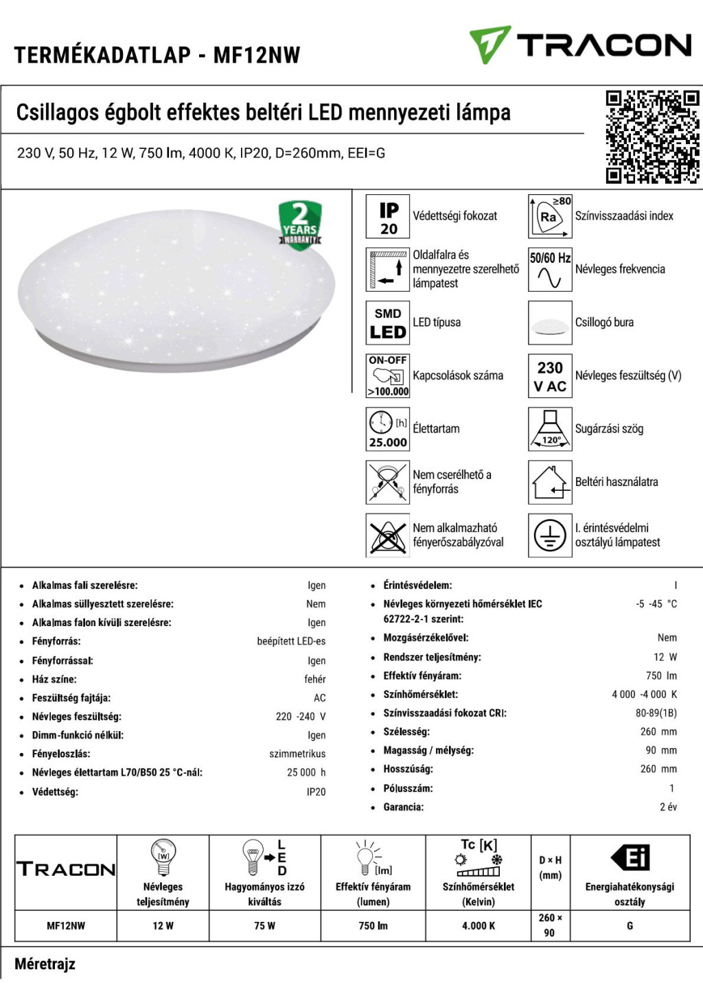 MF12NW Csillagos égbolt effektes beltéri LED mennyezeti lámpa230 V, 50 Hz, 12 W, 750 lm, 4000 K, IP2