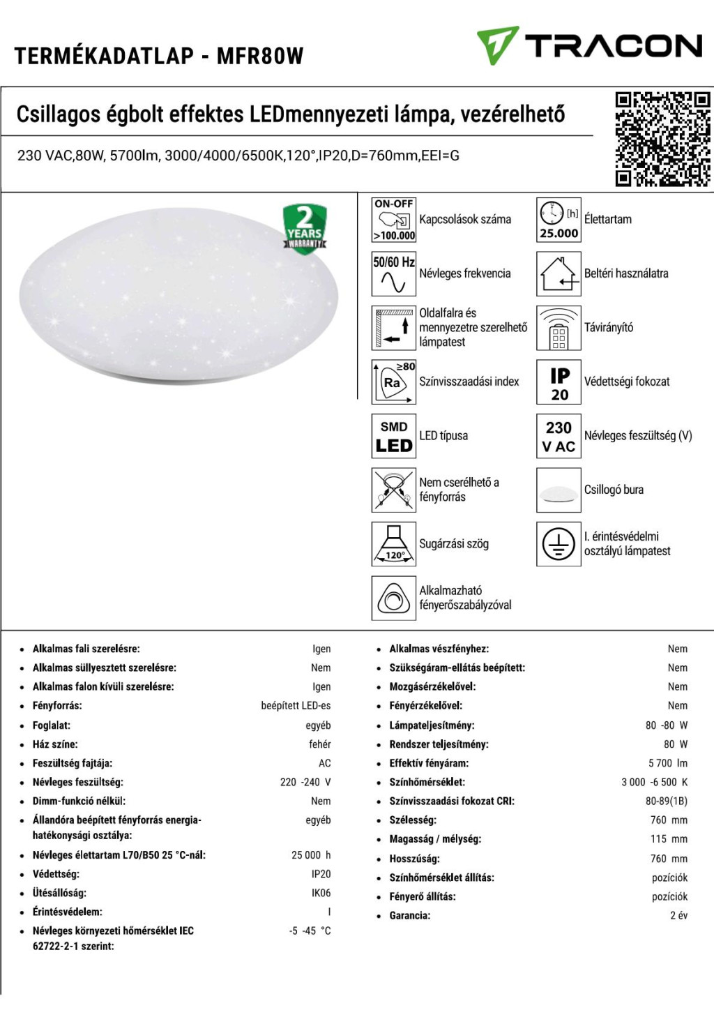 MFR80W Csillagos égbolt effektes LEDmennyezeti lámpa, vezérelhető230 VAC,80W, 5700lm, 3000/4000/6500