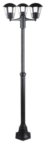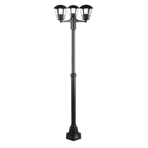 Klasszikus megjelenésű kültéri állólámpa 3 db foglalattal, UV sugárzásnak ellenálló kivitelben. 181 cm magas, a karoknál 50 cm átmérőjű, fekete színű fém lámpatest és víztiszta műanyag betétes lámpabúrák. A lámpatest E27-es foglalatú, max. 3x 60W teljesítményű fényforrásokkal használható.