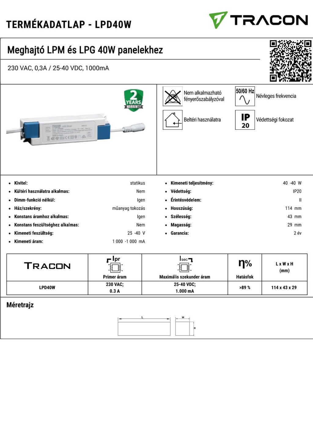 LPD40W LPD40W Meghajtó LPM és LPG 40W panelekhez230 VAC, 0,3A / 25-40 VDC, 1000mA