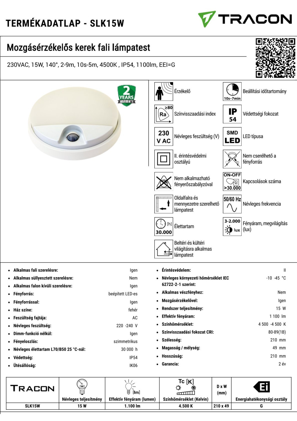SLK15W Mozgásérzékelős kerek fali lámpatest230VAC, 15W, 140°, 2-9m, 10s-5m, 4500K , IP54, 1100lm, EE