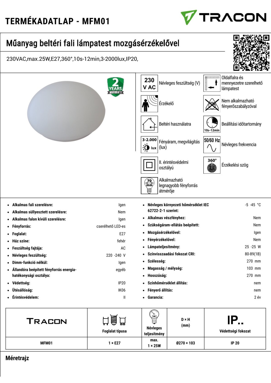 Műszaki adatok 230VAC,max.25W,E27,360°,10s-12min,3-2000lux,IP20,