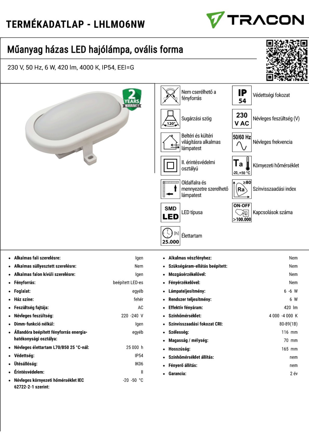 LHLMO6NW Műanyag házas LED hajólámpa, ovális forma230 V, 50 Hz, 6 W, 420 lm, 4000 K, IP54, EEI=G
