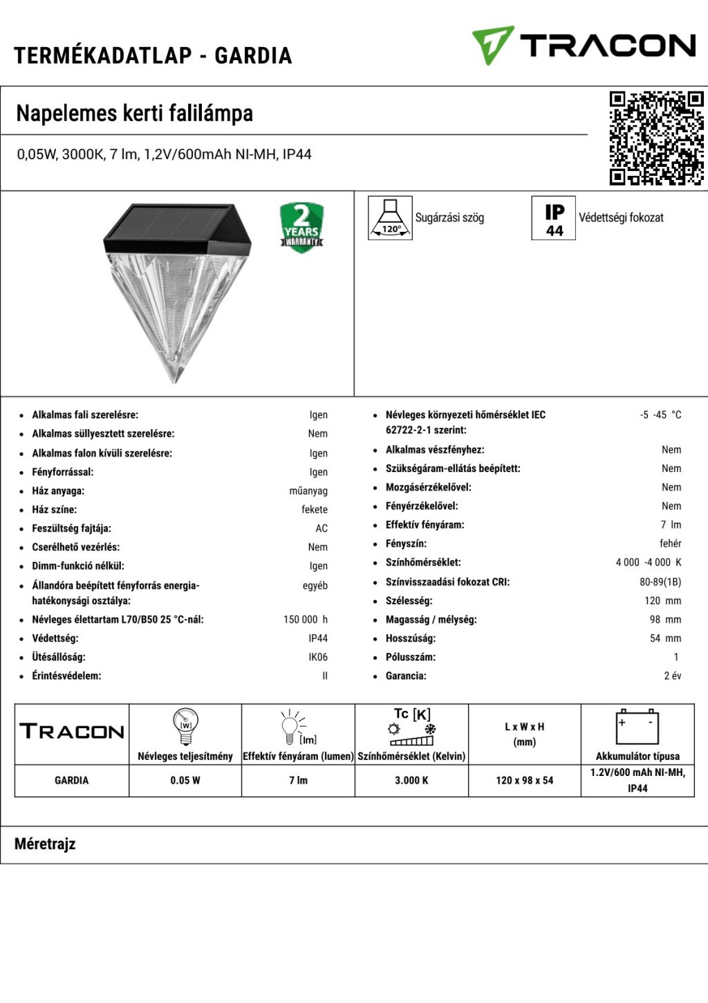 GARDIA GARDIA Napelemes kerti falilámpa0,05W, 3000K, 7 lm, 1,2V/600mAh NI-MH, IP44