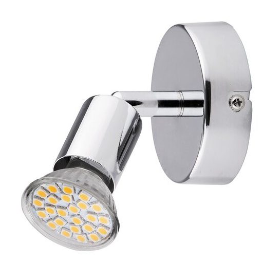 Modern megjelenésű fali spotlámpa 1 db foglalattal és energiatakarékos LED fényforrással. 11 cm magas, króm színű, fémből készített lámpatest és pozícionálható lámpabúra. A lámpatestbe helyezett LED fényforrás 3W teljesítmény mellett 250 lm fényerőt, valamint 3000K, melegfehér színű fényt biztosít. Izzócserét követően a fali lámpa GU10-es foglalatú, max. 50W teljesítményű halogén vagy LED fényforrással is használható.