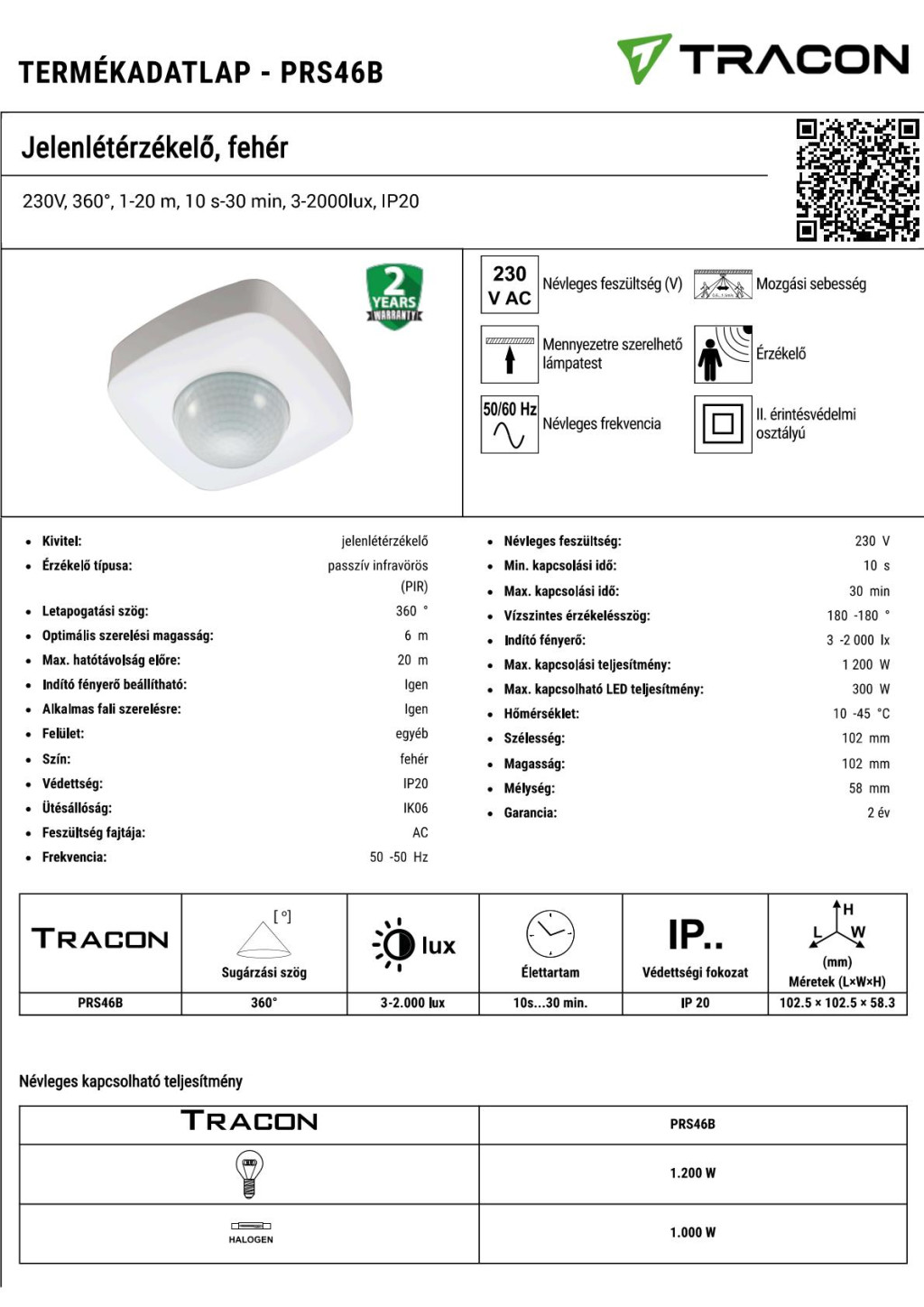 PRS46B PRS46B Jelenlétérzékelő, fehér230V, 360°, 1-20 m, 10 s-30 min, 3-2000lux, IP20