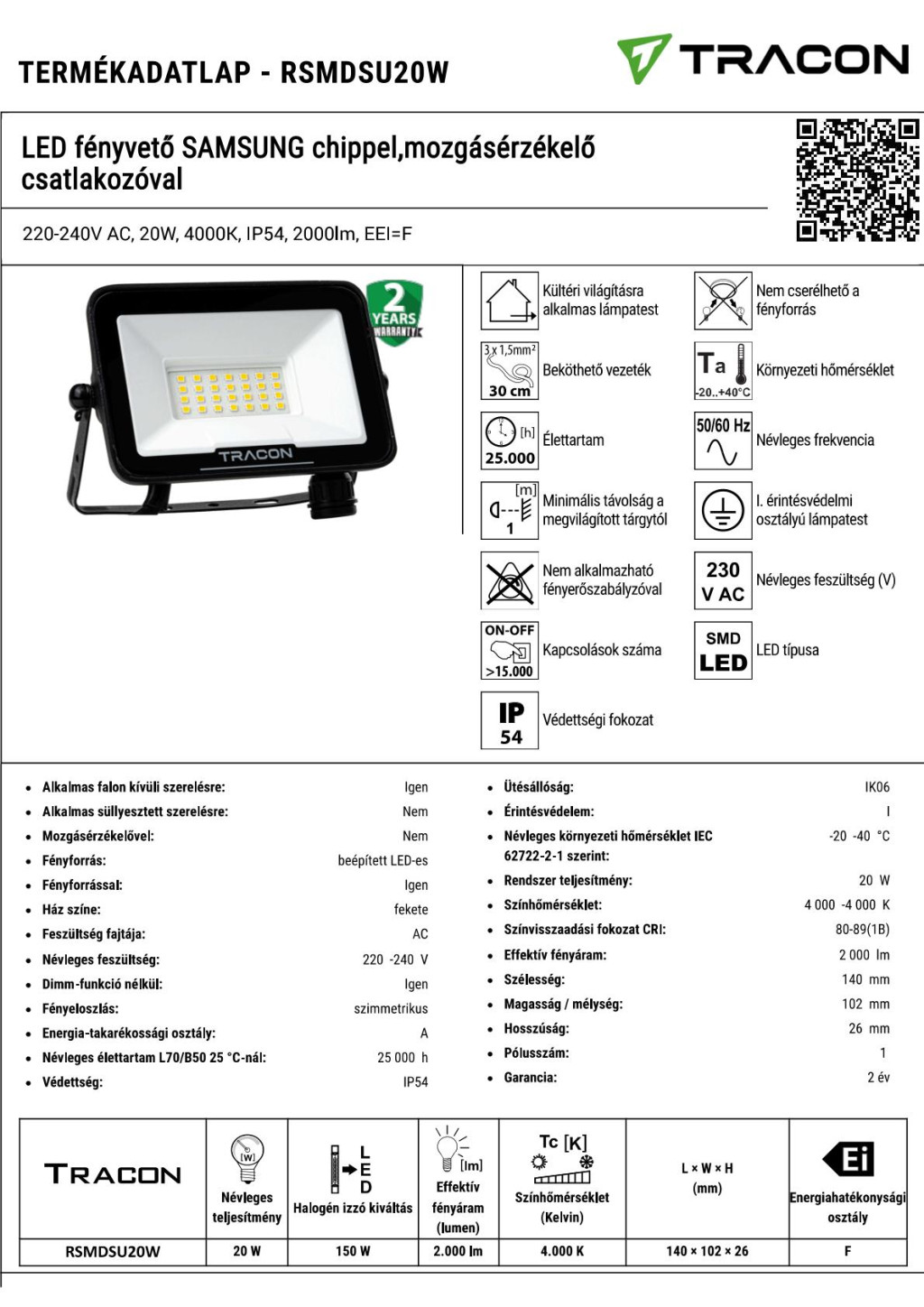 RSMDSU20W LED fényvető SAMSUNG chippel,mozgásérzékelő csatlakozóval 220-240V AC, 20W, 4000K, IP54, 2