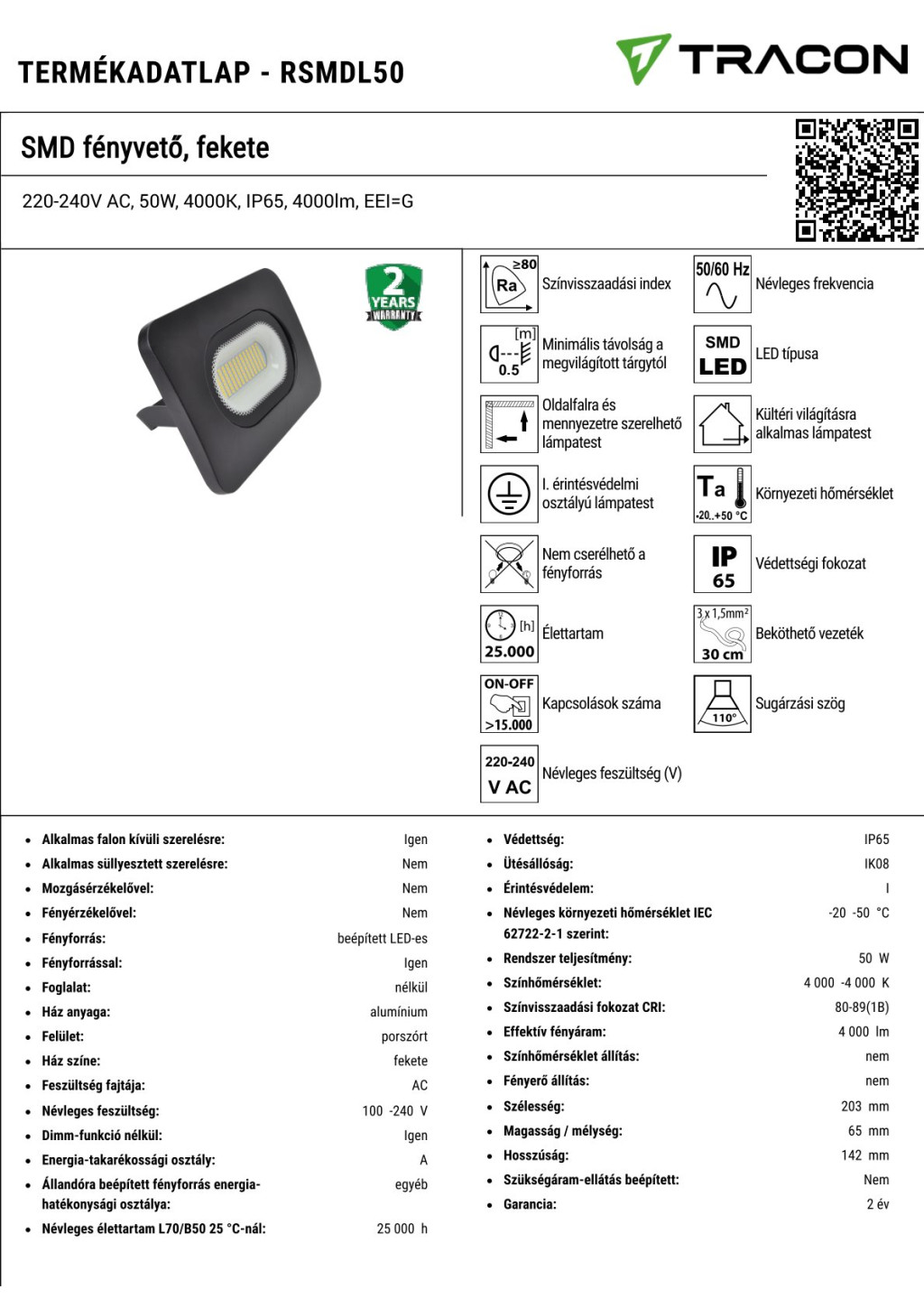 RSMDL50 SMD fényvető, fekete220-240V AC, 50W, 4000K, IP65, 4000lm, EEI=G