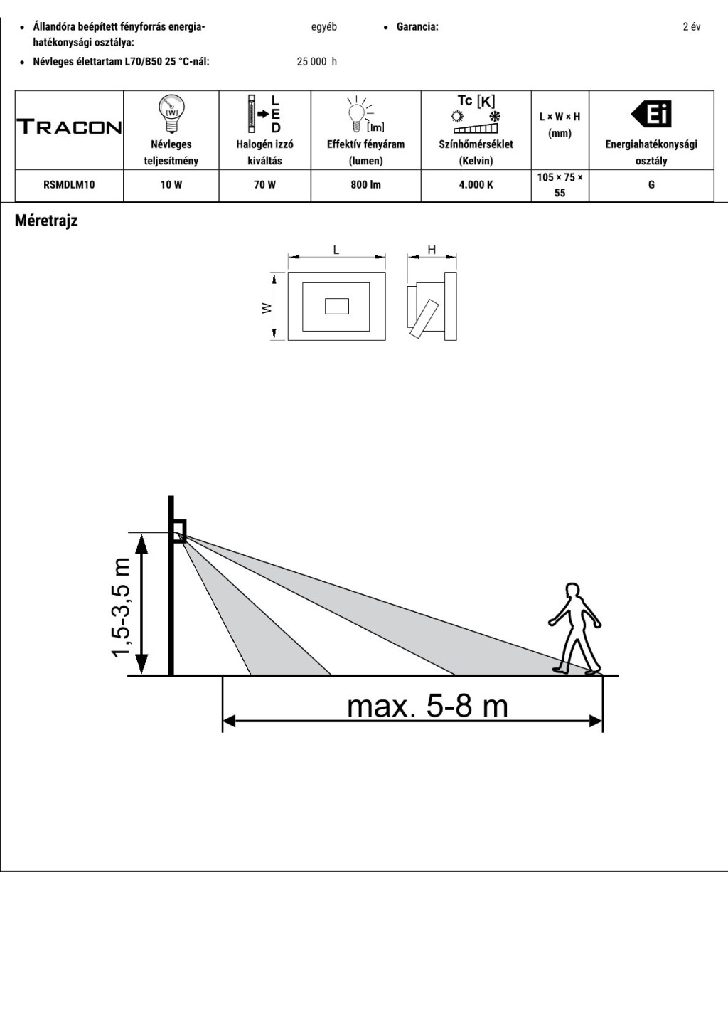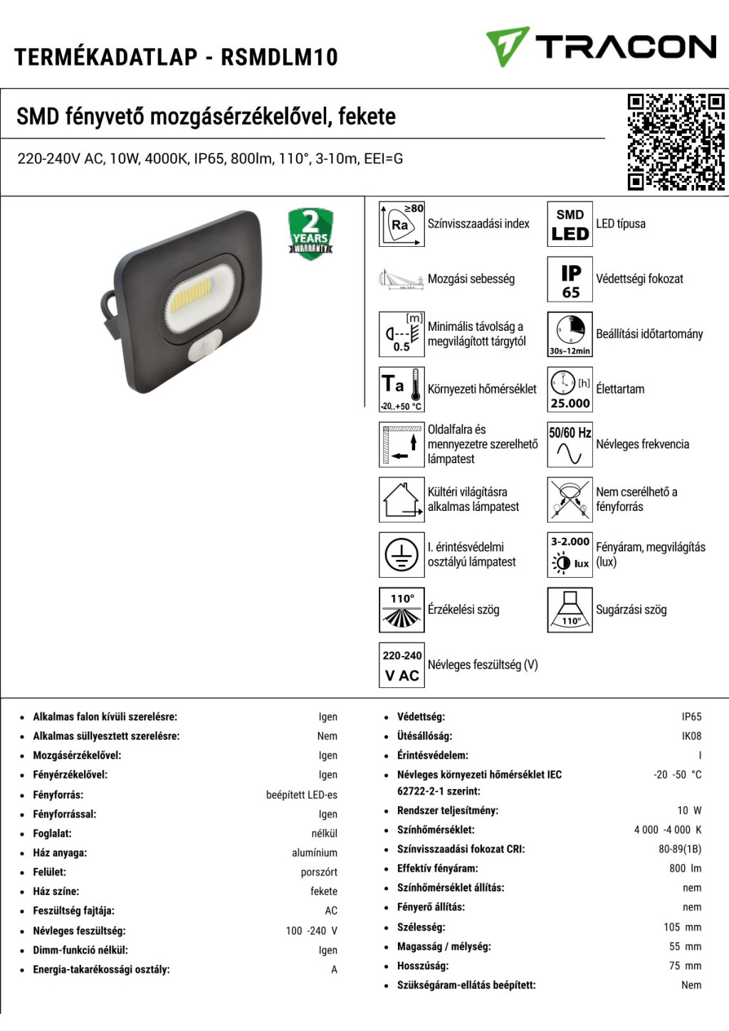 RSMDLM10 SMD fényvető mozgásérzékelővel, fekete220-240V AC, 10W, 4000K, IP65, 800lm, 110°, 3-10m, EE
