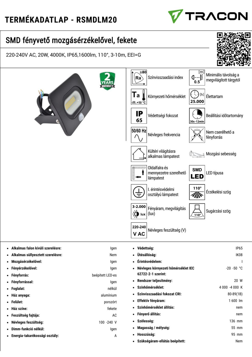 RSMDLM20 SMD fényvető mozgásérzékelővel, fekete220-240V AC, 20W, 4000K, IP65,1600lm, 110°, 3-10m, EE