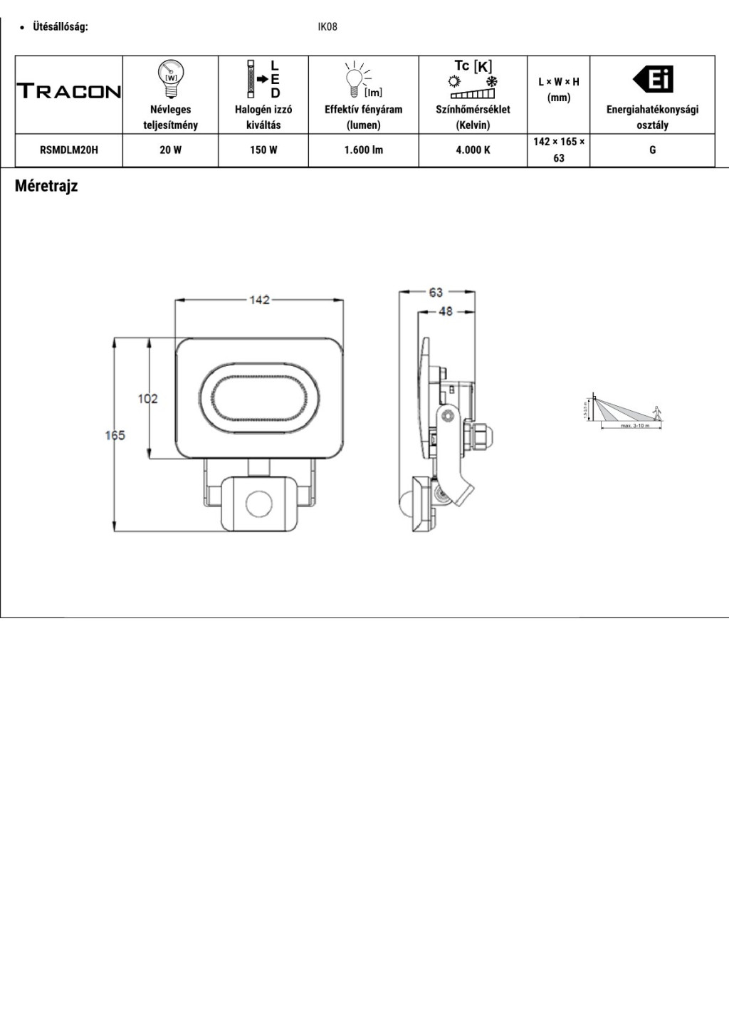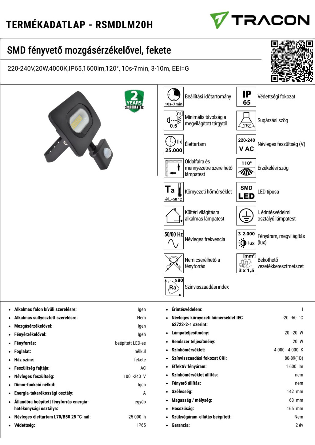 RSMDLM20H SMD fényvető mozgásérzékelővel, fekete220-240V,20W,4000K,IP65,1600lm,120°, 10s-7min, 3-10m