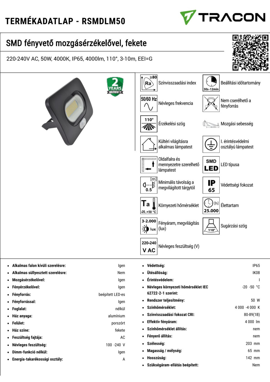 RSMDLM50 SMD fényvető mozgásérzékelővel, fekete220-240V AC, 50W, 4000K, IP65, 4000lm, 110°, 3-10m, E