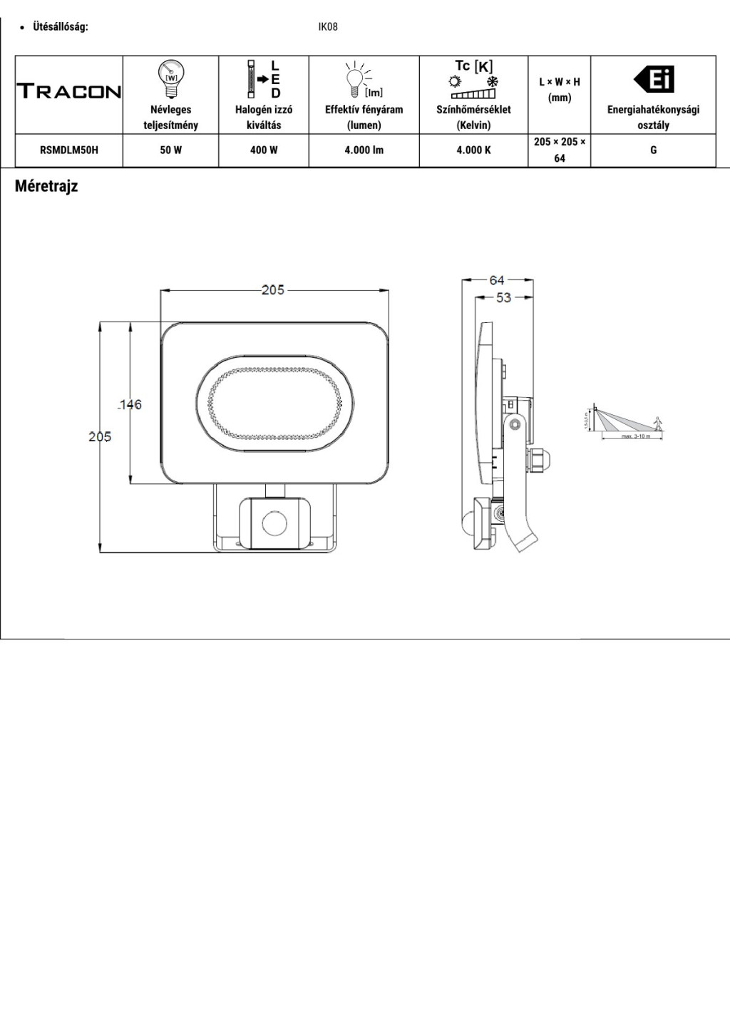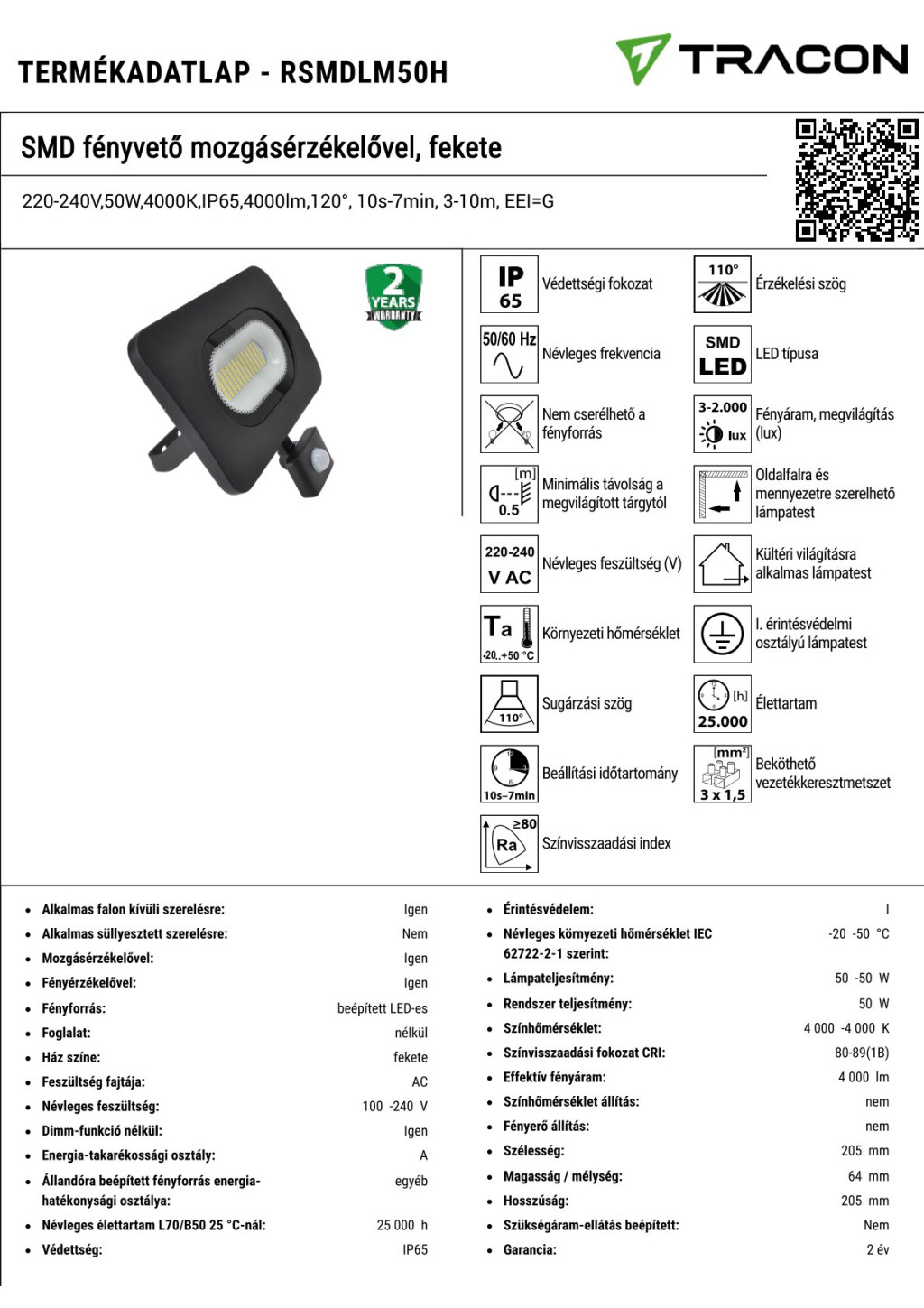 RSMDLM50H SMD fényvető mozgásérzékelővel, fekete220-240V,50W,4000K,IP65,4000lm,120°, 10s-7min, 3-10m