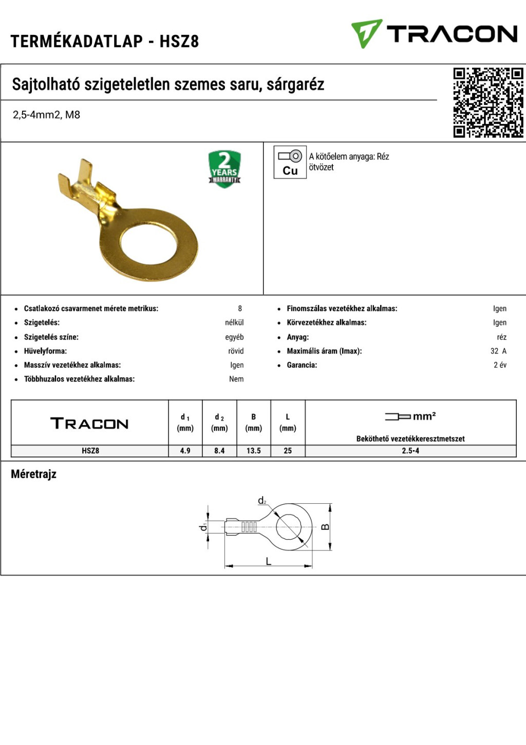 HSZ8 Sajtolható szigeteletlen szemes saru, sárgaréz2,5-4mm2, M8