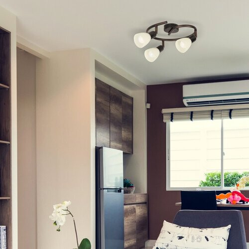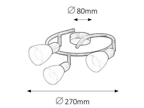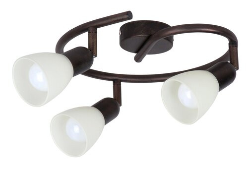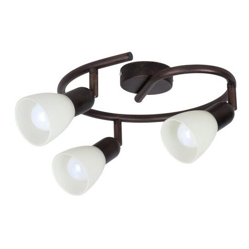 Időtlen stílusú spotlámpa, 3 darab foglalattal. 27 cm átmérőjű, antik barna színű fém szerkezet és pozícionálható, krém színű üvegbúrák, IP20-as védelemmel. A lámpatest E14-es foglalatú, max. 3x 40W teljesítményű, halogén vagy energiatakarékos fényforrásokkal is működtethető.