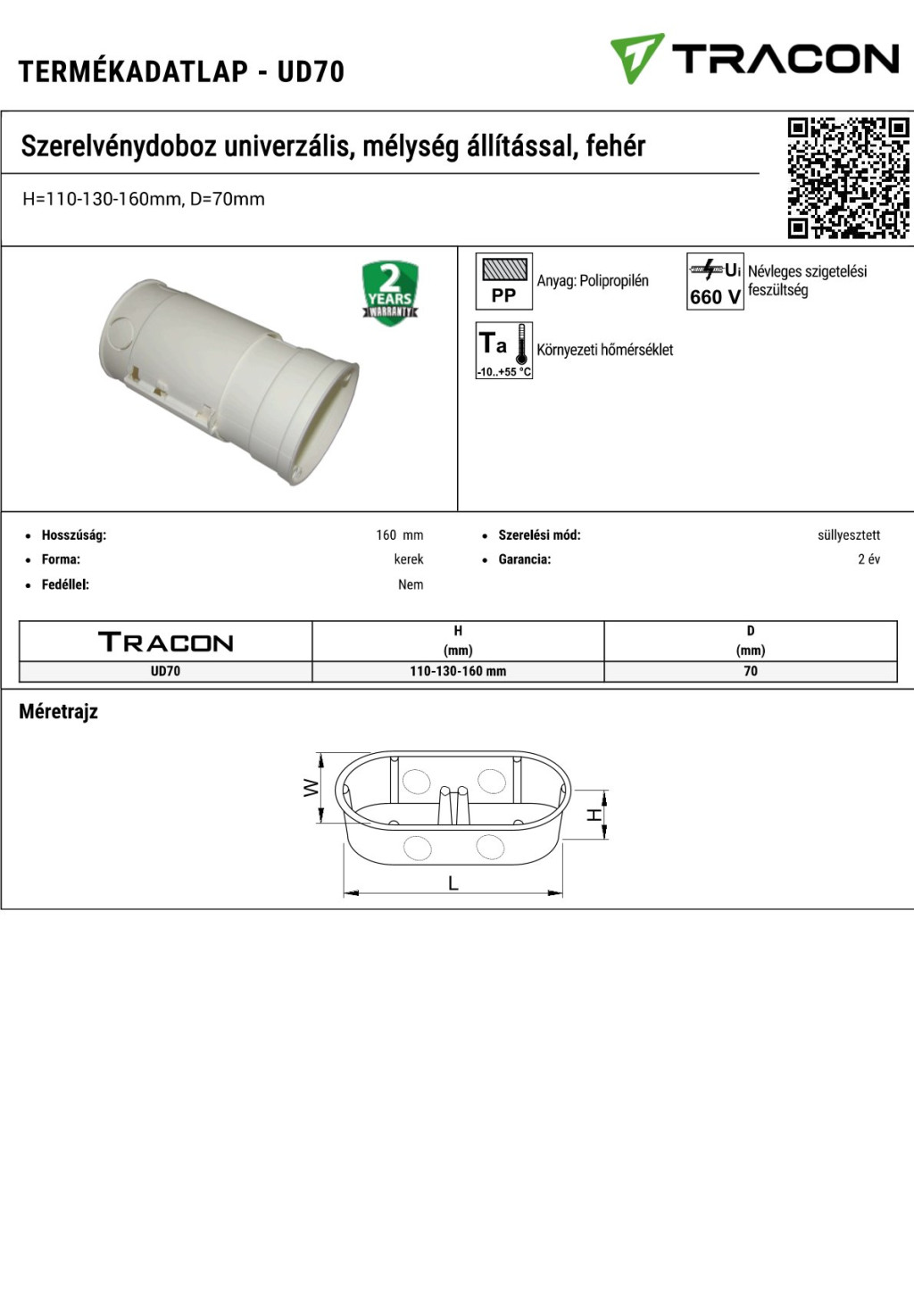UD70 Szerelvénydoboz univerzális, mélység állítással, fehérH=110-130-160mm, D=70mm